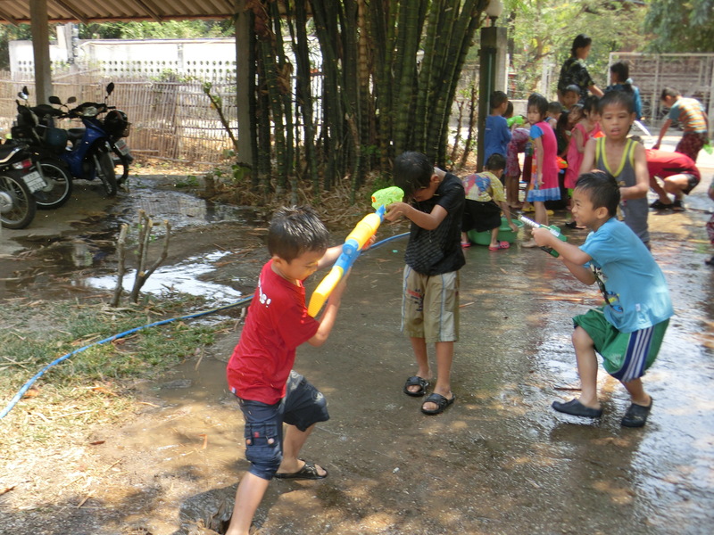 年長の子どもたちが多かった時代は、チェンマイの旧市街まで行って、水掛けを楽しんでいたようですが、今は小さい子どもが多いので、ホームの庭で水を掛け合って遊ぶのが定番です。今年も12日、13日と2日間にわたって庭で水掛け大会でした。