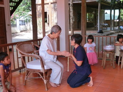 プレイルームに移動して、一人ずつメー美和に昨年中の非礼を詫び、感謝を伝え、これからもよろしくお願いしますの気持ちを伝えます。「メー美和、これからも元気でずっとバーンロムサイとともにいてください」「ずっと健康でありますように」という声もたくさん聞かれました。メー美和からは一人一人に祝福の言葉をかけます。